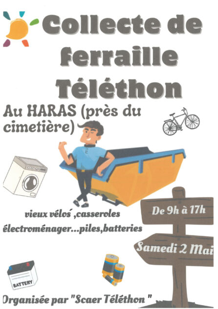 Après le succès de la première collecte de ferraille l’an dernier, l’association Scaër Téléthon, en organise une nouvelle, le samedi 2 mai 2026, de 9 h à 17 h. Deux bennes seront mises à disposition sur le terrain situé près des anciens haras de Kerjégu, du côté du cimetière. On pourra y déposer les vieux vélos, des casseroles, de l’électroménager, des barbecues, des lave-linge, des tondeuses,… etc. À cette occasion, l’association récupérera aussi les anciennes radios et les piles et les batteries. Les gains collectés seront reversés à l’association.